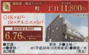 しばらくすると、新聞の折り込みチラシで物件の広告が出ていました。1.18億円。もともと土地だけで2区画で7,500万円以上の価格になっていましたので、上物のアパート込みで考えれば割安なのかもしれませんが、値段が高いので買い手がつくのですかね?