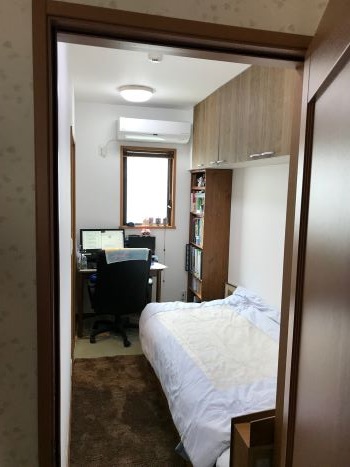 寝室を妻のワークスペースとして使えるようにしましたので、書斎にベットを配置し、部屋にとして使えるようにしました。これまでWCで使っていたスペースが書斎と一体化されましたので、これまでの書斎の入口に加え、WC時代のドアを残していますので、寝室からも書斎に行けるようになりました。