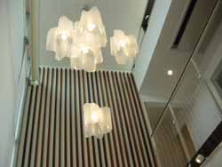 天井から降りている照明と高さを引き立てる縦に伸びたウッドが絶妙のバランスでした。
