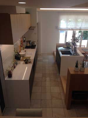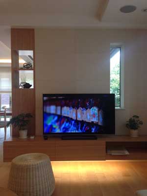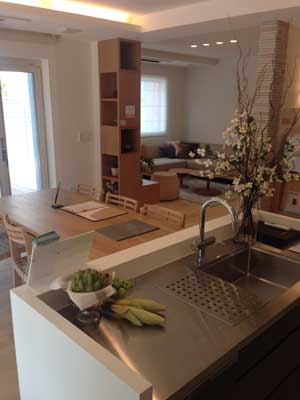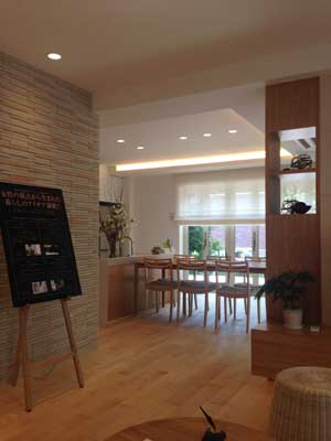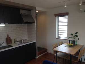 | 最近の流行りのキッチンとダイニングを複雑なレイアウトで仕切り、導線をとる空間になっています。 |