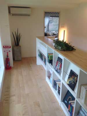 | 2階のホールと廊下はローボードと吹き抜けで開放感抜群でした。ホールにまでエアコン設置するのは展示場ならではですかね。戸建てだとなかなかそこまではいかないかな。 |