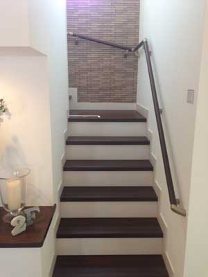 | キッチンの奥には広めのパントリー、ワークスペースも併設され広めの書斎といった雰囲気でした。装備階段の踏みしろは濃い木目で傷が見え難いデザイン。 |
