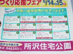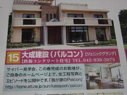 所沢住宅公園(西東京・所沢地区)の総合チラシです。他のモデルハウスの記事は建物性能のアピールや坪単価などが出ているのですが、大成建設のコメントは、「我が家のPalcon」の紹介のみあります。なんとまぁ思いきったことをしたものです。お陰で質問メール殺到?の今日この頃です!
